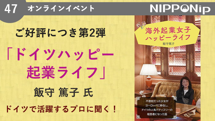 ご好評につき第二弾!在独邦人だけでなく、日本、世界中にファンをもつ飯守篤子氏をお招きしてお送りするオンラインイベント。*参加希望者へ、前々日夕方〜夜にNIPPONipニュースレターでリンクをお知らせします。事前にニュースレターへのご登録 をぜひ!