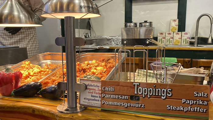 食材名そのまんまのBlumenkohl、もしくはFrittierte Blumenkohl(フリッティエァテ ブルーメンコール)などのネーミングで売られている揚げカリフラワー。衣をまとったカリフラワーは、外側さっくり、中はほくほく。カリフラワー本来のおいしさをダイレクトに感じられるのはもちろん、屋台メニューでしっかり野菜を摂れるのが◎。