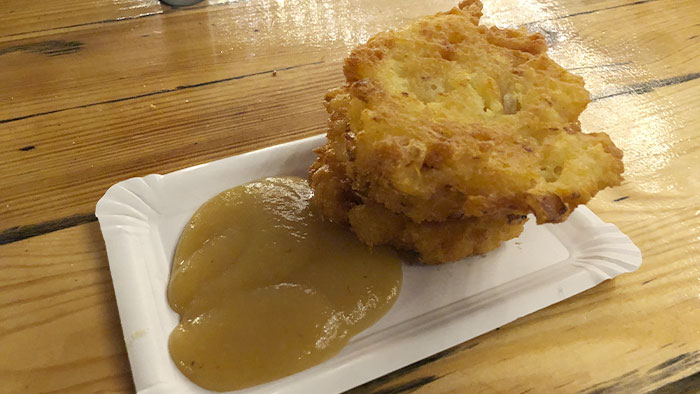 クリスマスマーケットのジャガイモ料理といって、フライドポテトと並んで代表に挙げられるのがこちら。すりおろしたジャガイモを揚げ焼きしたもので、別名、Reibekuchen(ライベクーヘン)とも呼ばれています。