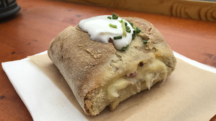 発祥地はドレスデンだけど、近年、他の地域にも出現し始めたのが、このボリュームパン。噛みごたえのあるどっしりしたパンの中に、チーズやハムなどさまざまな具材が詰まっているのが特徴。窯を併設している屋台が多いので、焼きたてを味わえることも。