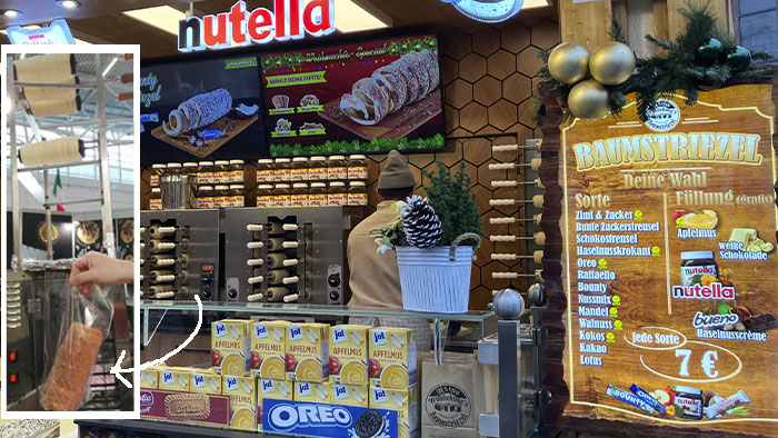 キャラメリゼされたバウムシュトリーツェルに、シナモン&シュガー、カラーチョコ、オレオなど、豊富な種類の中からトッピングを選べるのが楽しい。
