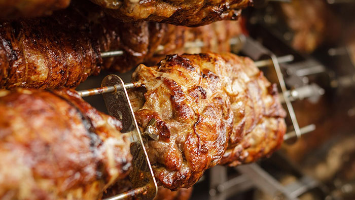 串(spiess)刺しにして、じっくり焼いた(braten)豚肉をパンに挟んでいただきます。甘さを引き出された飴色たまねぎが一緒にサンドされていて、肉の旨みを存分に楽しめる!